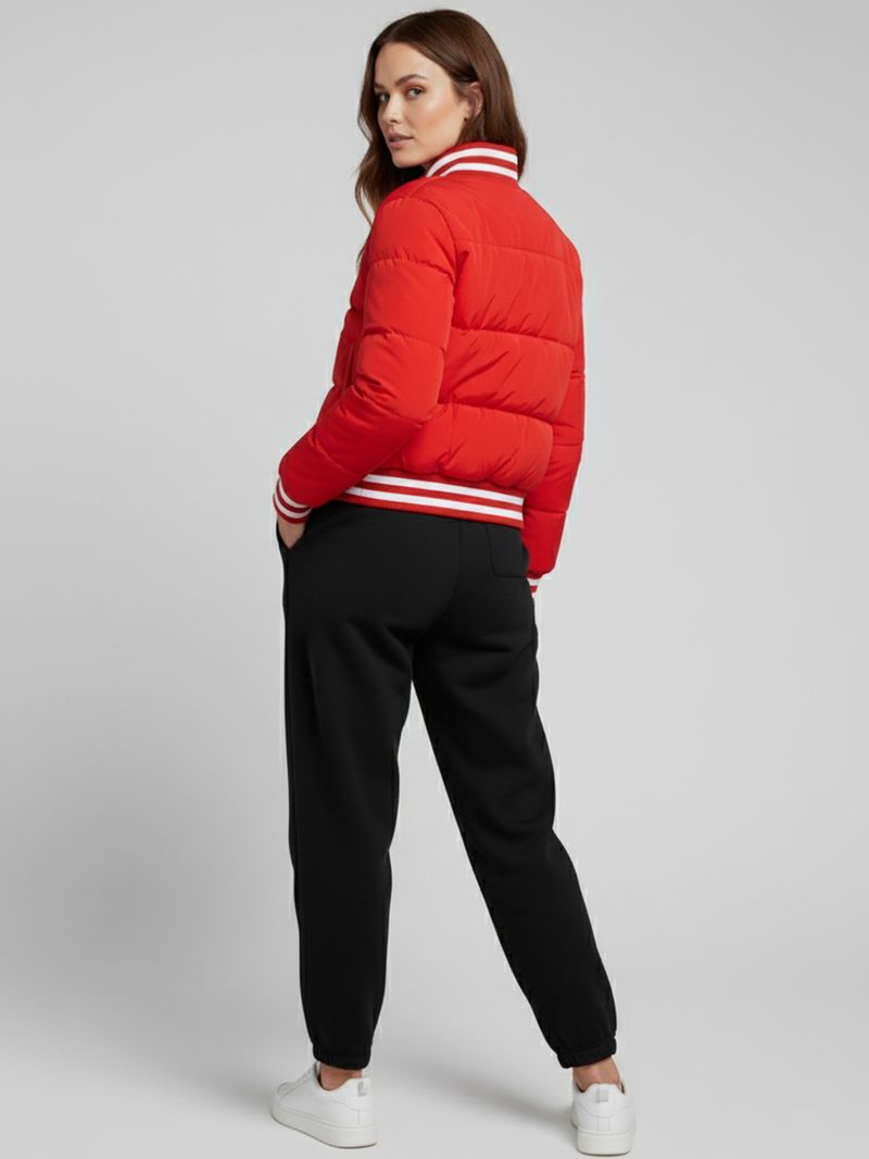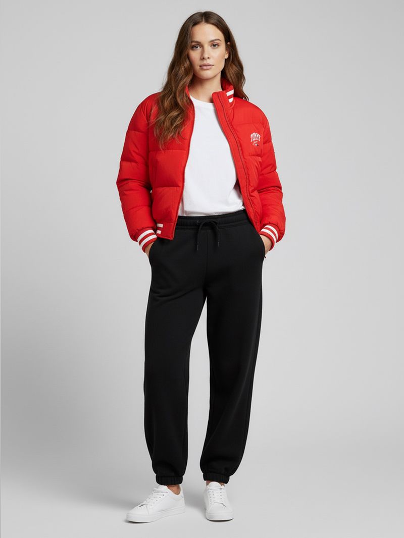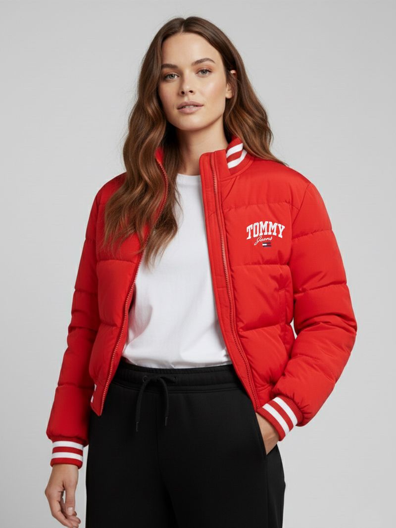 Mantente cálida y con estilo con esta campera puffer de Tommy Jeans. El diseño corto y acolchado se complementa con detalles de rayas blancas en el cuello, los puños y la cintura. Incluye un cierre frontal con cremallera y el logo de Tommy Jeans bordado.