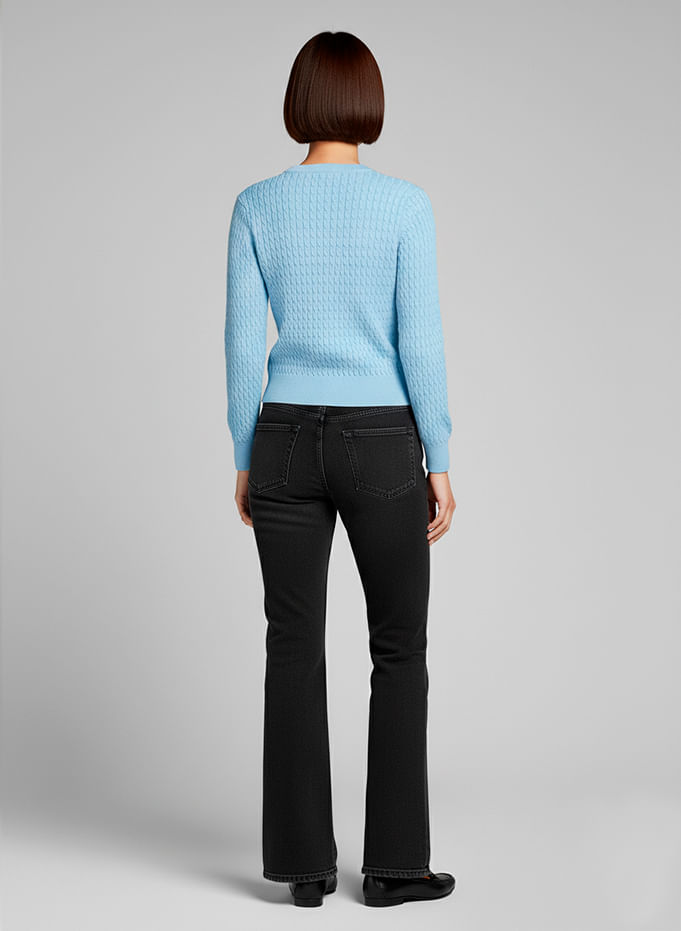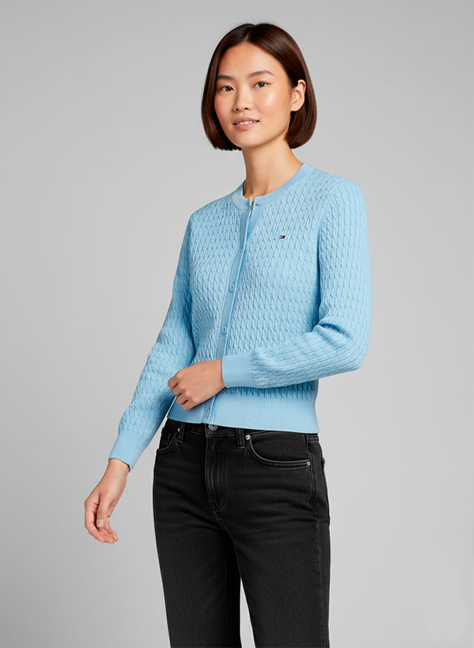 Este cárdigan de botones aúna un diseño atemporal de cuello redondo y un tejido de punto trenzado de algodón de estilo clásico.
