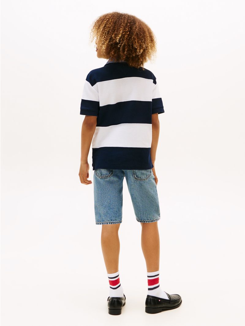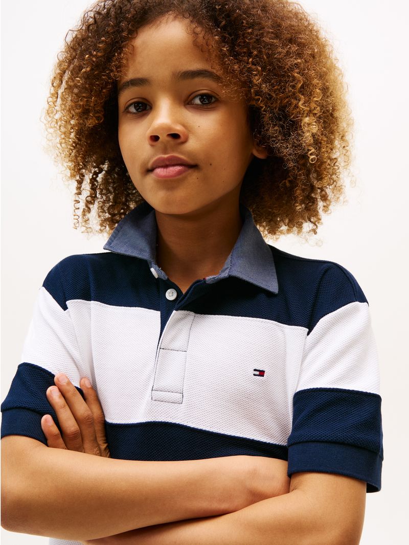Esta chomba, una versión refinada del modelo deportivo clásico, luce un cuello de tejido denim y un atemporal diseño de rayas.