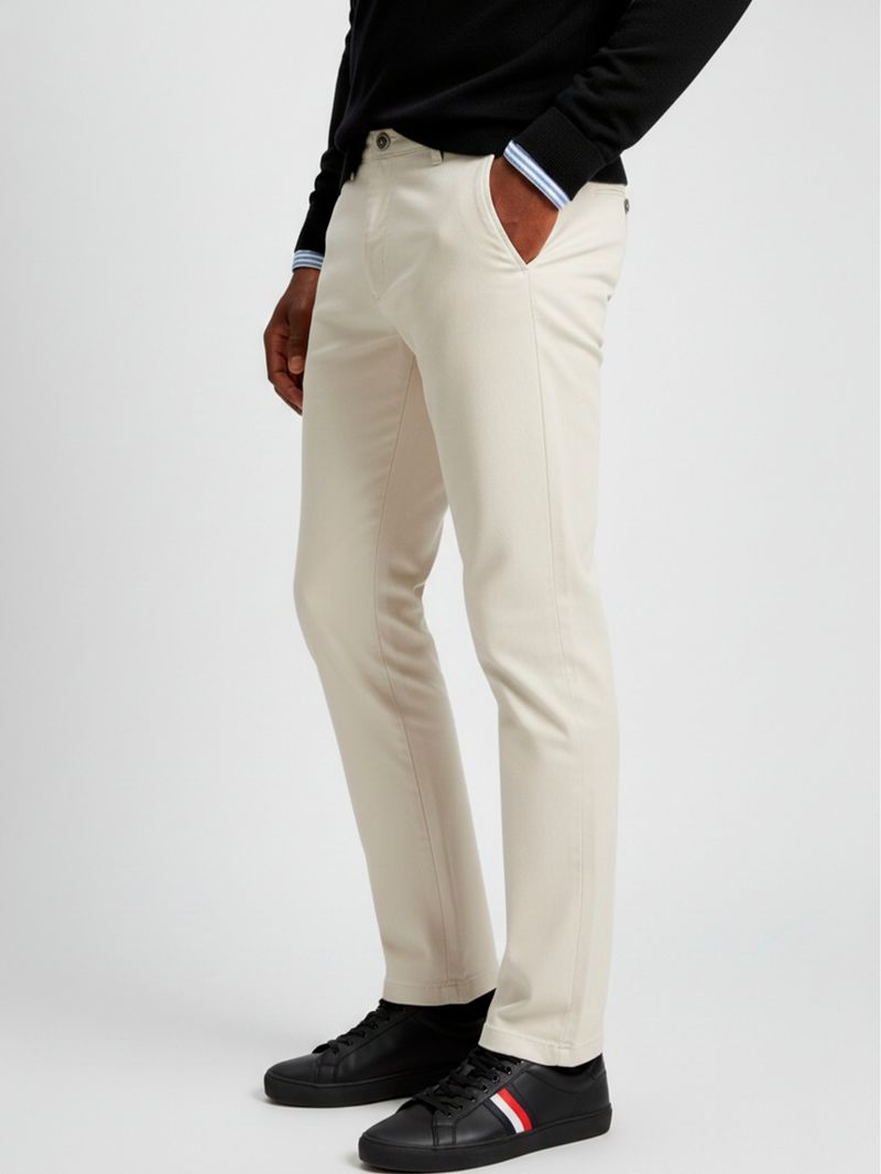 Este pantalón de pierna recta, confeccionado en satén de algodón elástico, es un modelo cómodo de estilo semielegante con un clásico diseño de cinco bolsillos.
