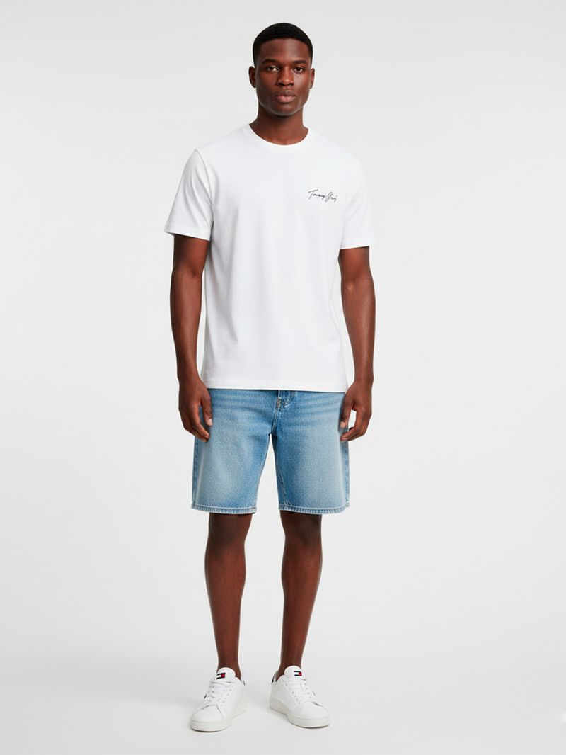 Es una remera de manga corta con un estilo casual y moderno, ideal para looks informales y con un toque distintivo. Presenta un corte regular, y un logo en forma de firma de Tommy Jeans en el pecho.