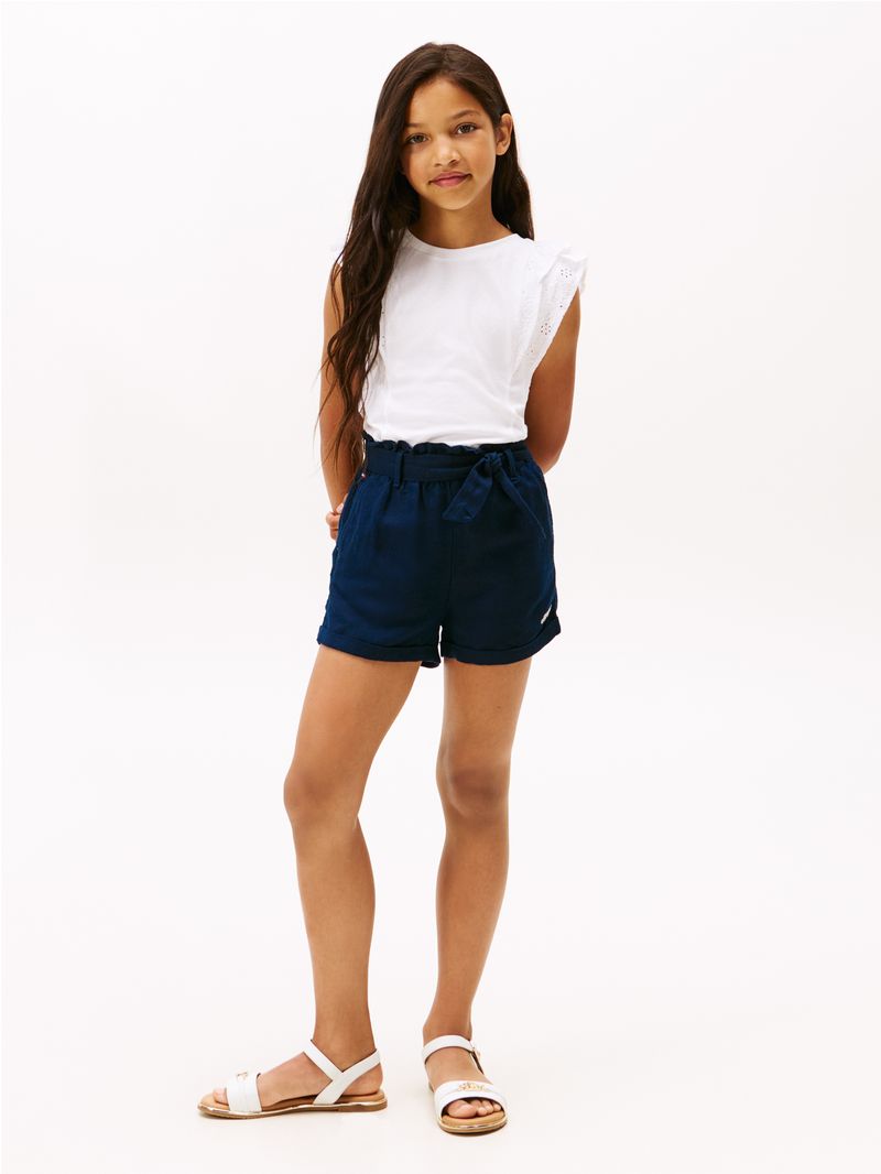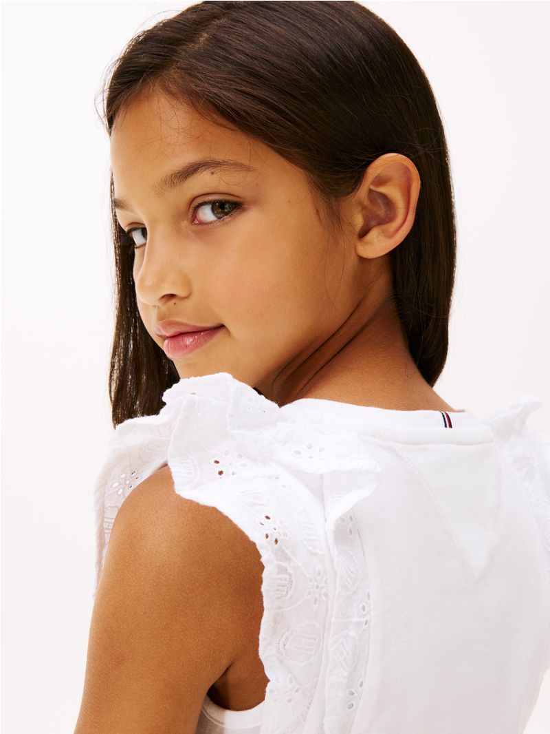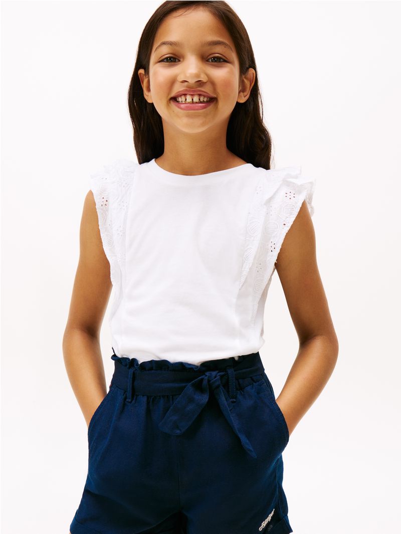 Esta remera de punto, confeccionada en puro algodón, destaca por los volantes con diseño calado en las mangas, que le aportan un toque distintivo y texturizado.