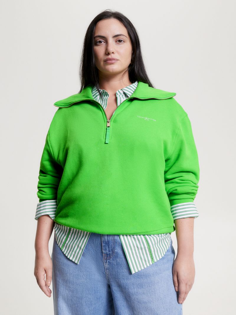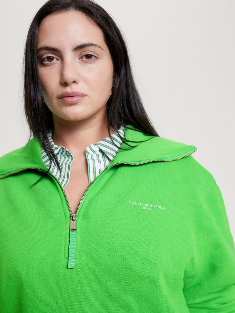 Este sweater, una reinterpretación del clásico buzo, cuenta con un cuello de media cremallera que aporta versatilidad a la prenda.